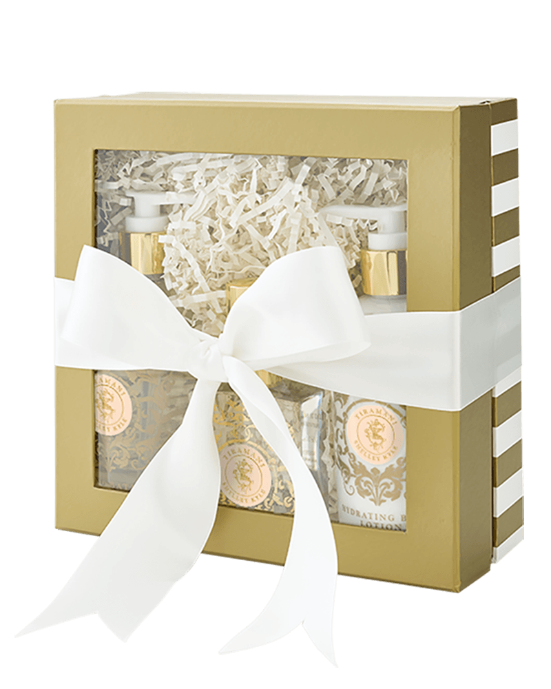 Our version of the perfect gift- 2 oz parfum, 8 oz Hydrating lotion, and 8 oz Foaming Bath Gel. Packaged in a beautiful cream and gold gift box with ribbon.