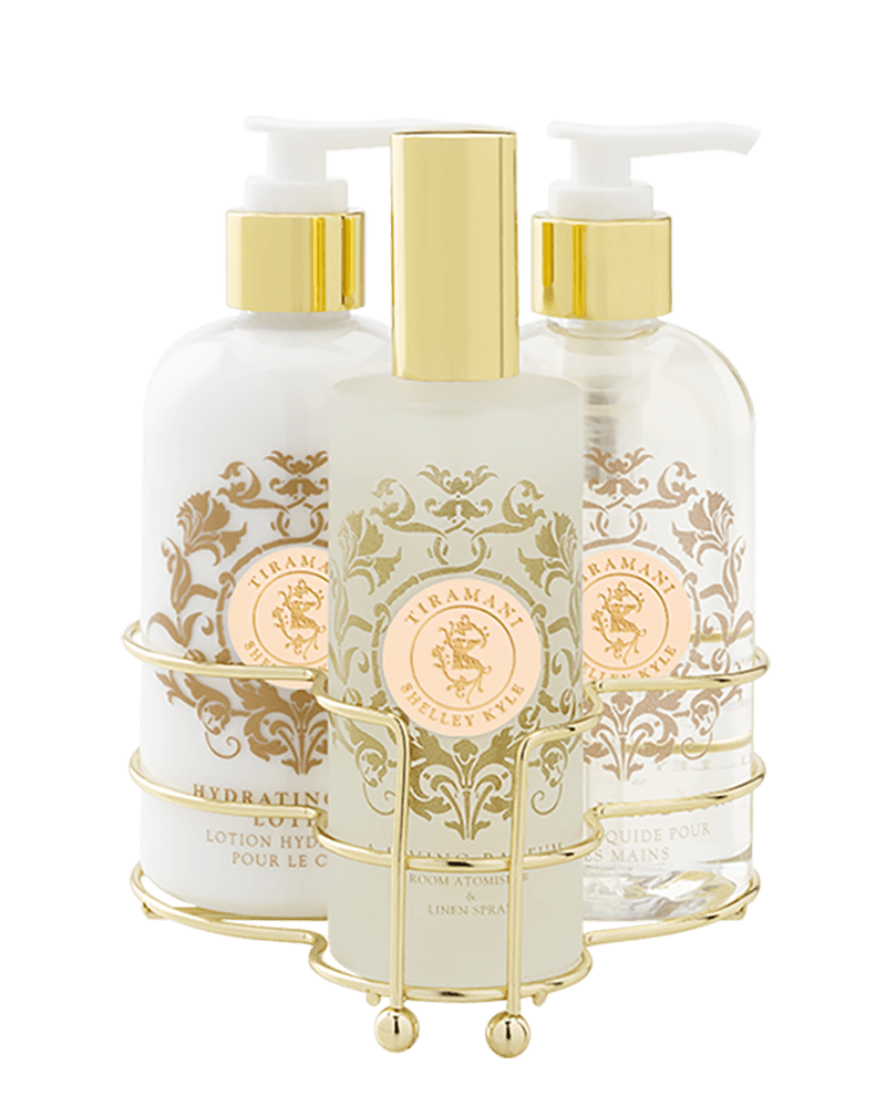 Need a way to refresh your home and your skin? Our Tiramani Three-Piece Caddy with Lotion, Liquid Hand Soap and Room Atomizer does both! Crafted with natural ingredients that are gentle on your skin, this three-fold product offers a feeling of deep clean and moisture, while offering a fun fragrance combination you’ll fall in love with.